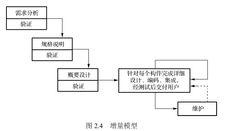 指一步一步将软件建造起来。在增量模型中,软件被视为一系列的增量构件来设计、实现、集成和测试,每个构件是由多种相互作用的模块所形成的提供特定功能的代码片段组成的。