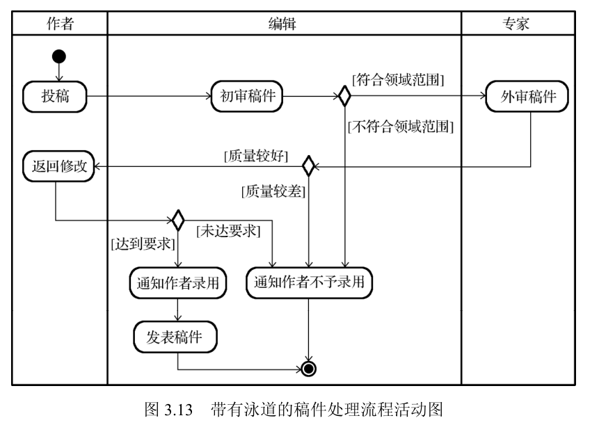 活动图中还有 “泳道 (Swimlane)” 的概念。泳道是一种角色的划分方法,每个角色的活动放置在对应的泳道中。