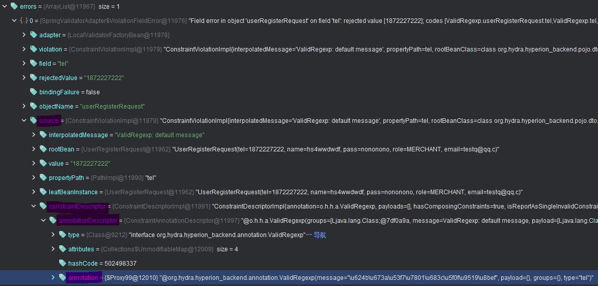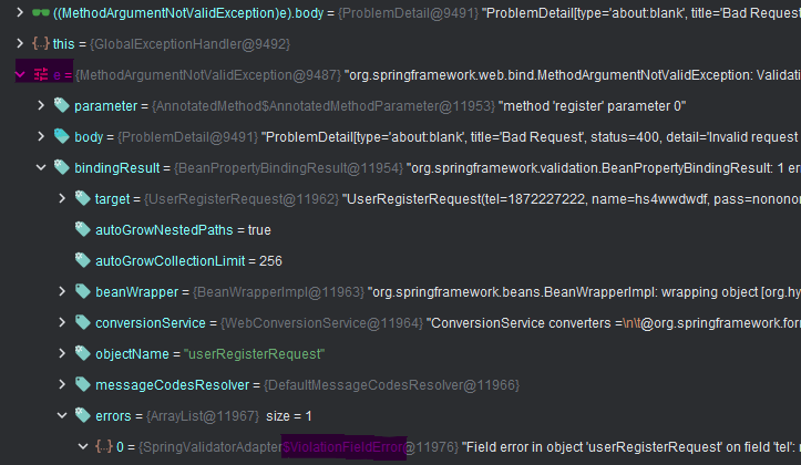 实现到这里,我们触发一下校验错误,在拦截器中看一下错误消息: