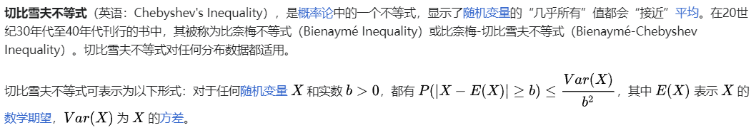 # [笔记] 概率论复习 # 统计定理 # 大数定律 通俗讲:样本数量越多,样本均值越接近期望。 样本均值收敛于真值。 是切比雪夫不等式的一种特殊应用。 # 切比雪夫不等式 # 贝叶斯定理 # 中心极限定理 通俗讲:独立同分布变量的标准化均值趋于标准正态分布。不受变量原始分布的影响。 适用条件: 所有变量相互独立 所有变量具有相同分布 变量的方差有限 # 随机过程 随机过程